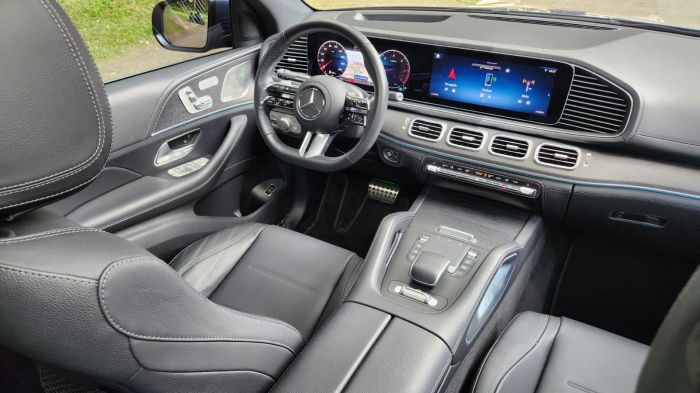 O sistema de som Burmester® Surround Sound conta com 13 alto-falantes e 590 watts de potência, além de compatibilidade com Dolby Atmos. O ar-condicionado THERMOTRONIC de quatro zonas permite ajustes individuais para motorista e passageiros. A iluminação ambiente oferece 64 opções de cores. Os bancos dianteiros em couro possuem ajustes elétricos, memória e suporte lombar, e o teto solar panorâmico integra os equipamentos de série.